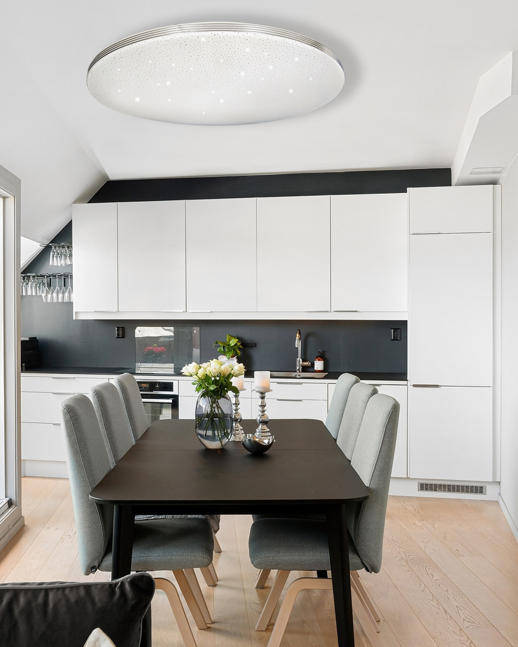 LED stropné svietidlo TR-612C - VENTA Trixline v bielej farbe so štyrmi striebornými prúžkami po obvode a trblietavým svetelným efektom. Svietidlo má variabilný dizajn, kedy môžete odňať strieborné prúžky a ponechať iba čisto biele okraje. Je určené do vnútorných priestorov ako sú obývacie izby, spálne, haly, kancelárie, chodby a podobné miesta. Pomocou priloženého ovládača môžete prepínať medzi tromi svetelnými teplotami v rozmedzí 2700K až 6500K , ktoré je možné stmievať podľa potreby pre navodenie príjemnej atmosféry. Pri maximálnom stlmení klesá spotreba až na iba 8W z pôvodných 60W, čo zaručuje úsporu energie.Ďalšou možnosťou na diaľkovom ovládači je aj nočný režim a funkcia 30 sekúnd po uplynutí ktorých sa LED svietidlo samo vypne. Svietidlo si po vypnutí pamätá posledný nastavený režim , čo zaisťuje pohodlné a intuitívne používanie.